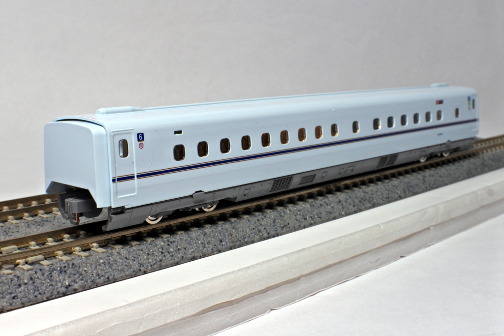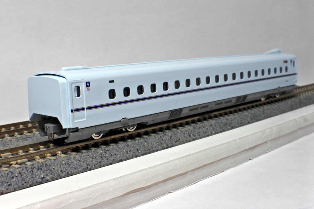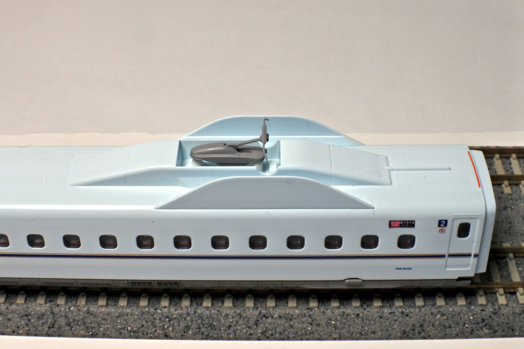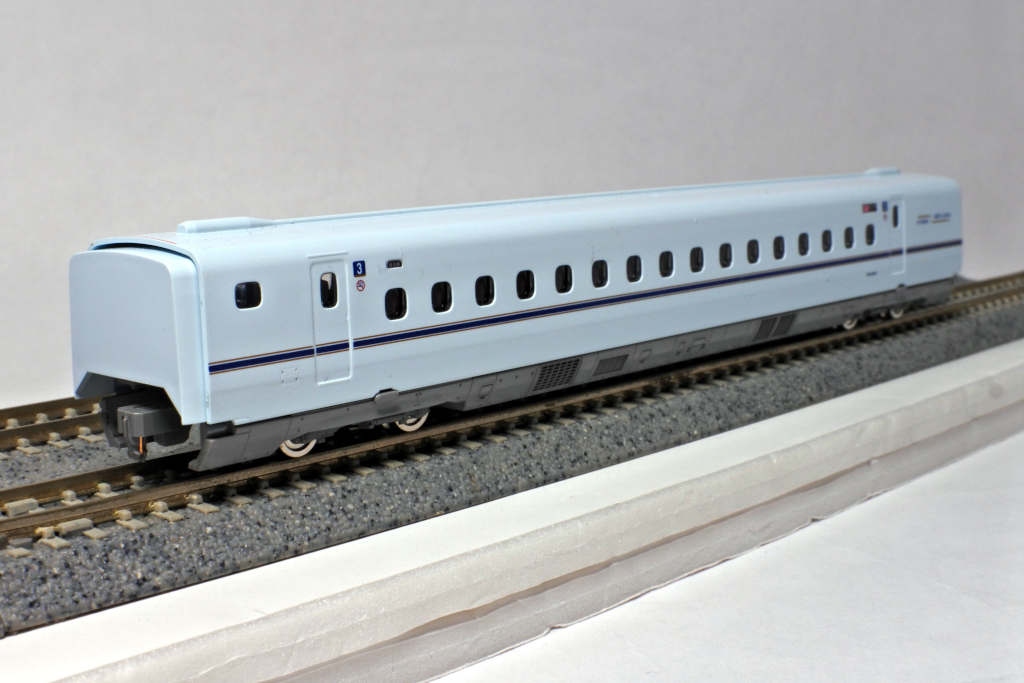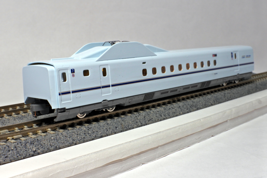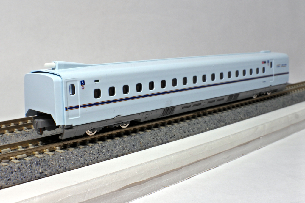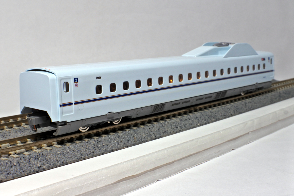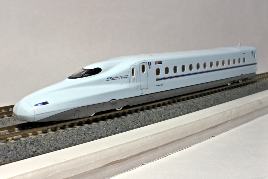 鹿児島中央寄りの先頭車です。先頭形状はシャープに再現されており、N700系らしいフォルムがしっかり表現されています。車体の青磁をイメージした白藍色とラインカラーの印刷も美しく仕上がっています。