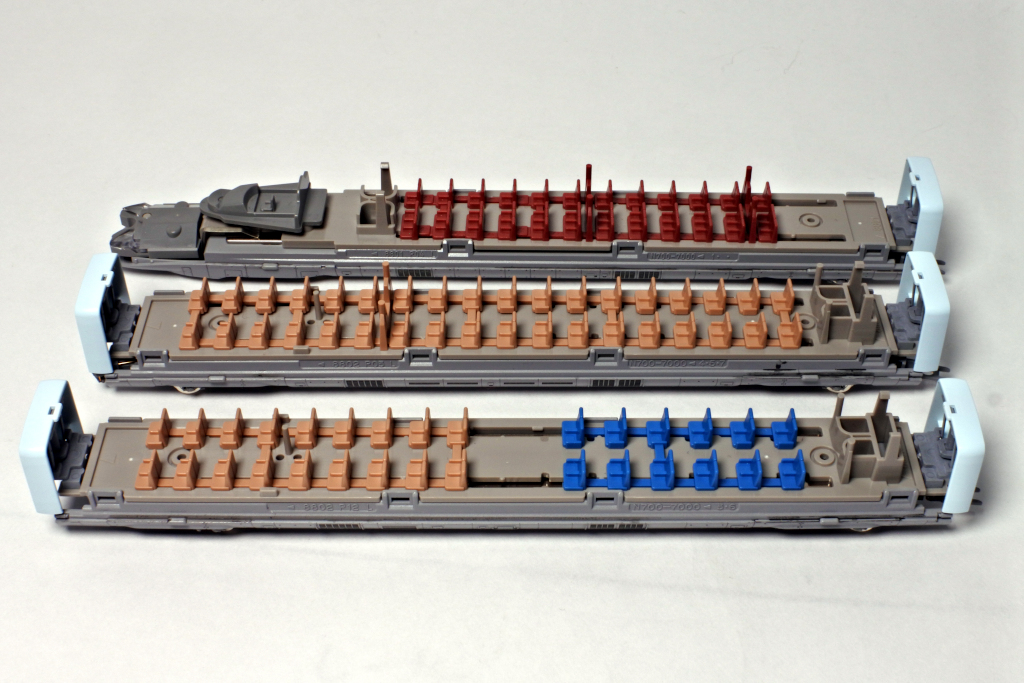 座席はすべて別パーツで再現されています。1~3号車は2+3列、4~8号車は2+2列、6号車は一部グリーン車となっており、それぞれで座席の色が作り分けられているのもポイントです。