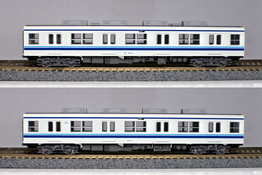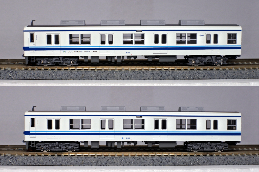 1つは8163Fがモデルで中期修繕車でヘッドライトは角型シールドビーム、方向幕でベンチレータは撤去されています。台車はFS356/056です。野田線・東上線と銘打っていて8463は幌が付いています。この形態での野田線での活躍はごく短期間なので東上線仕様と言って差し支えないと思います。